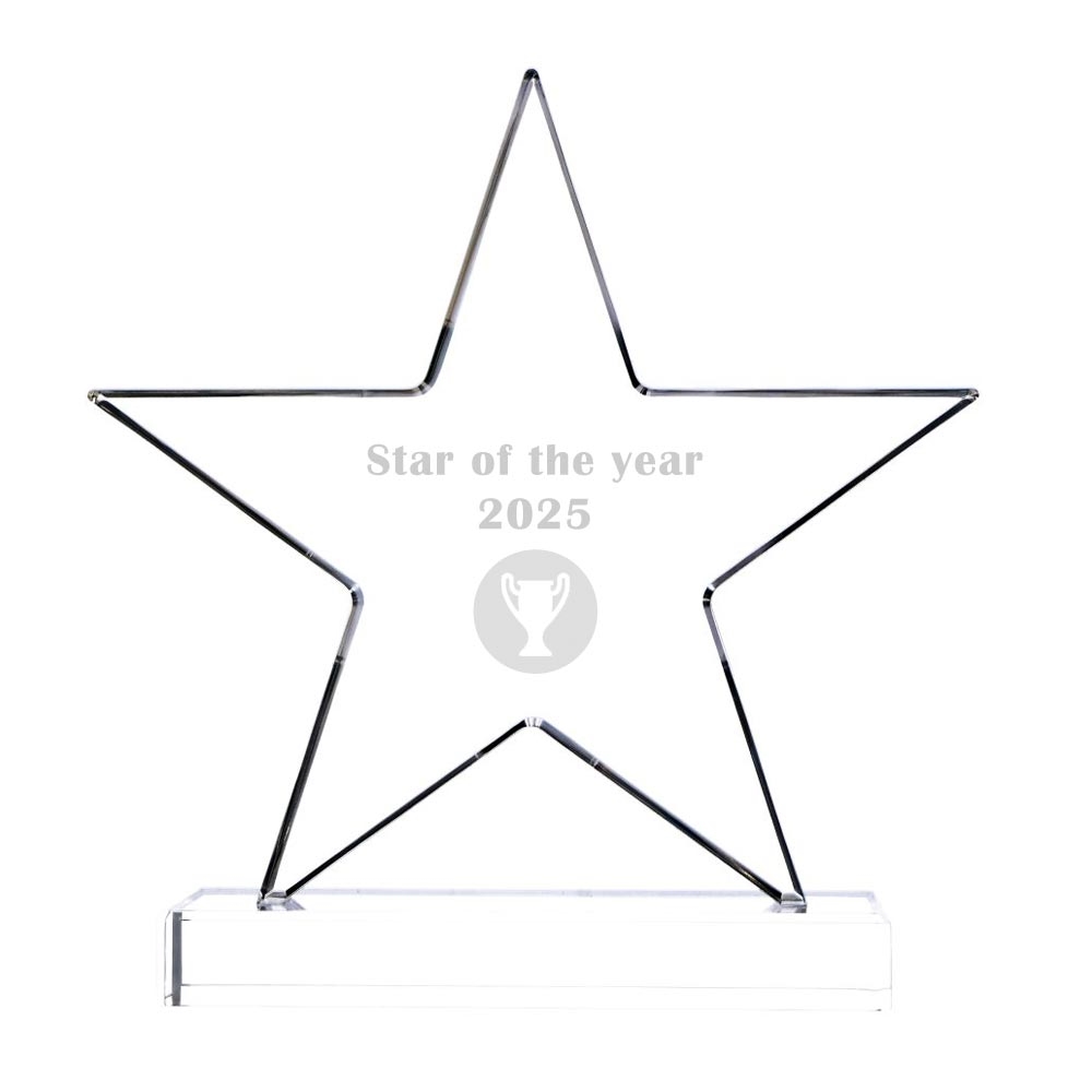 Award Star - Den stjerneformede award i plexiglas kombinerer klassisk symbolik med moderne elegance. De skarpe linjer og det eksklusive finish skaber et stilrent og professionelt udtryk, der passer perfekt til både erhvervsarrangementer, sportsbegivenheder og personlige hæderspriser.