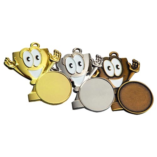 Børnemedalje Menton - Flot og sjov børnemedalje i guld, sølv eller bronze – perfekt som præmie til børn. Medaljen egner sig særligt godt til uddeling i børnehaver, fritidshjem, skoler, sportsarrangementer og idrætsdage.