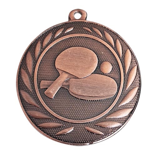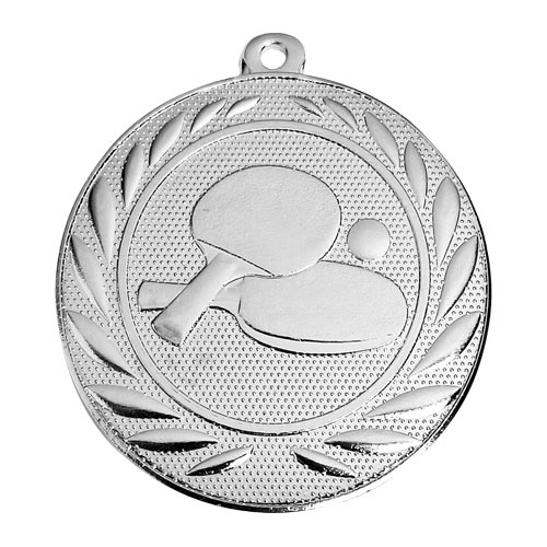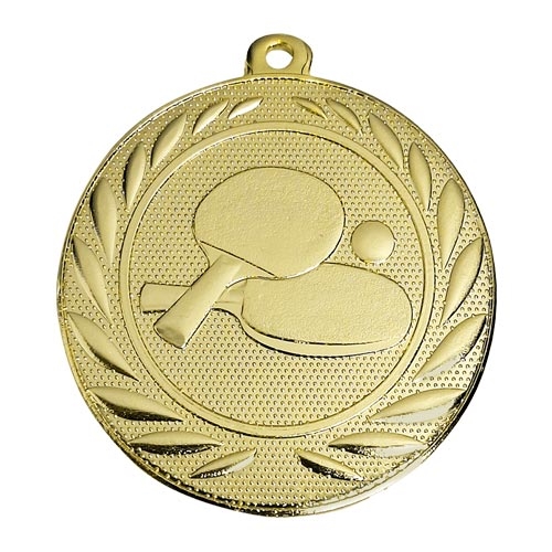 Bordtennis medalje 50mm - Rigtig flot og robust bordtennis medalje på 50mm i diameter. På forsiden et flot relief motiv med bat og bold. Medaljen har blank bagside, der er velegnet til gravering. Se vores store udvalg af medaljebånd og vælg præcis den farve eller kombination du ønsker.