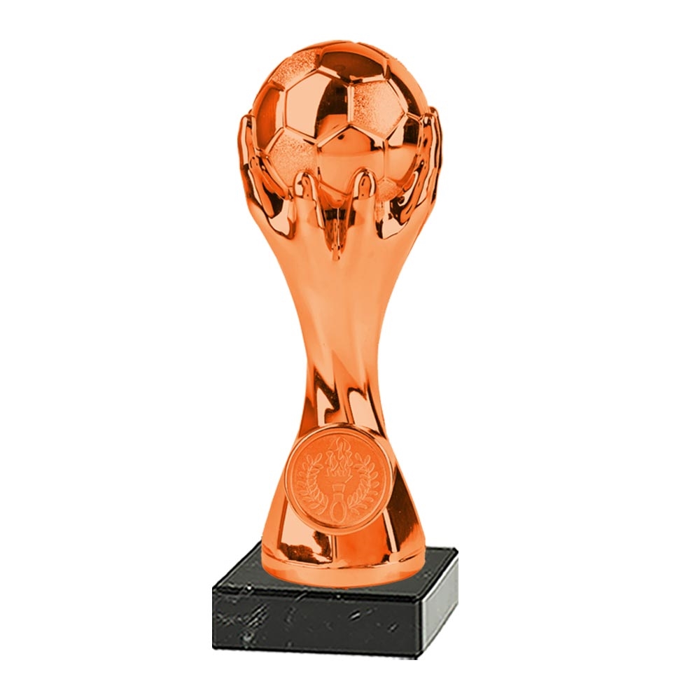 Fodboldstatuette i bronze– Flot statuette med to hænder, der løfter en fodbold i triumf. Der kan monteres et motiv i cirklen på forsiden samt et graveret skilt på marmorsoklen.