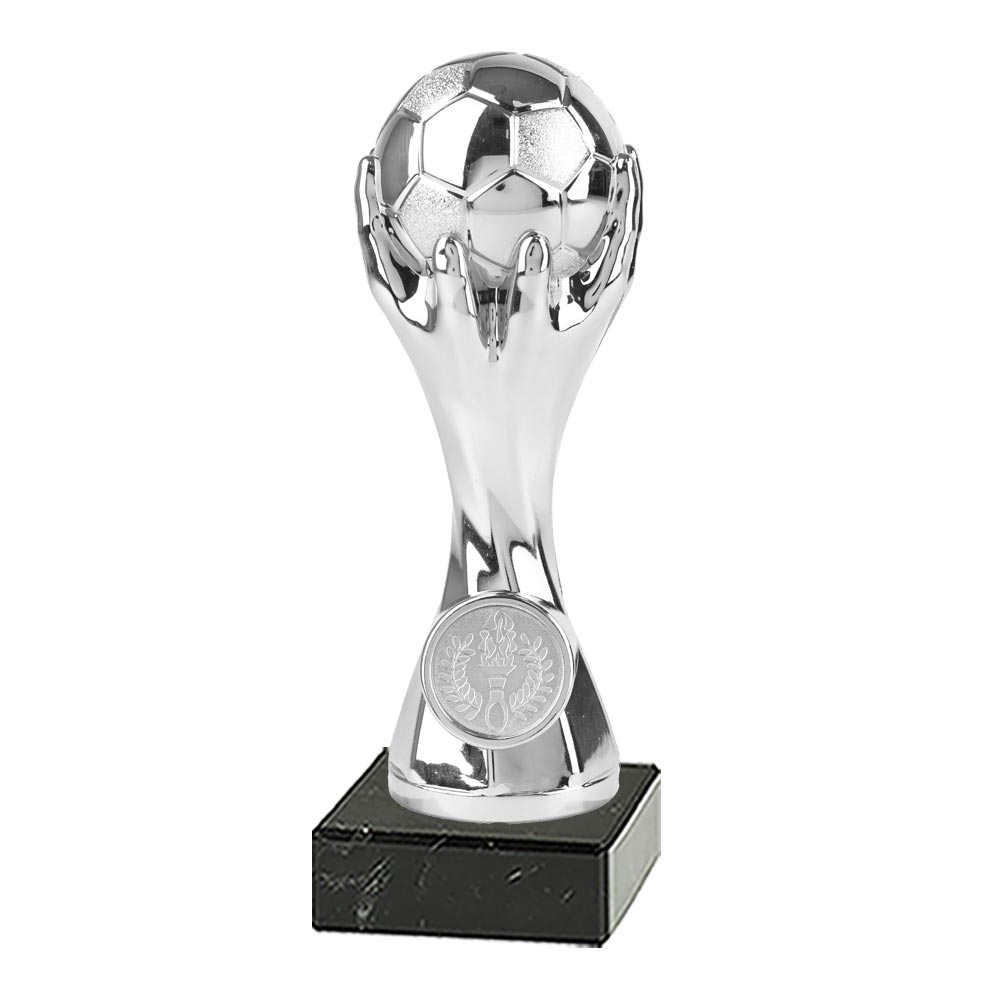 Fodboldstatuette i sølv– Flot statuette med to hænder, der løfter en fodbold i triumf. Der kan monteres et motiv i cirklen på forsiden samt et graveret skilt på marmorsoklen.